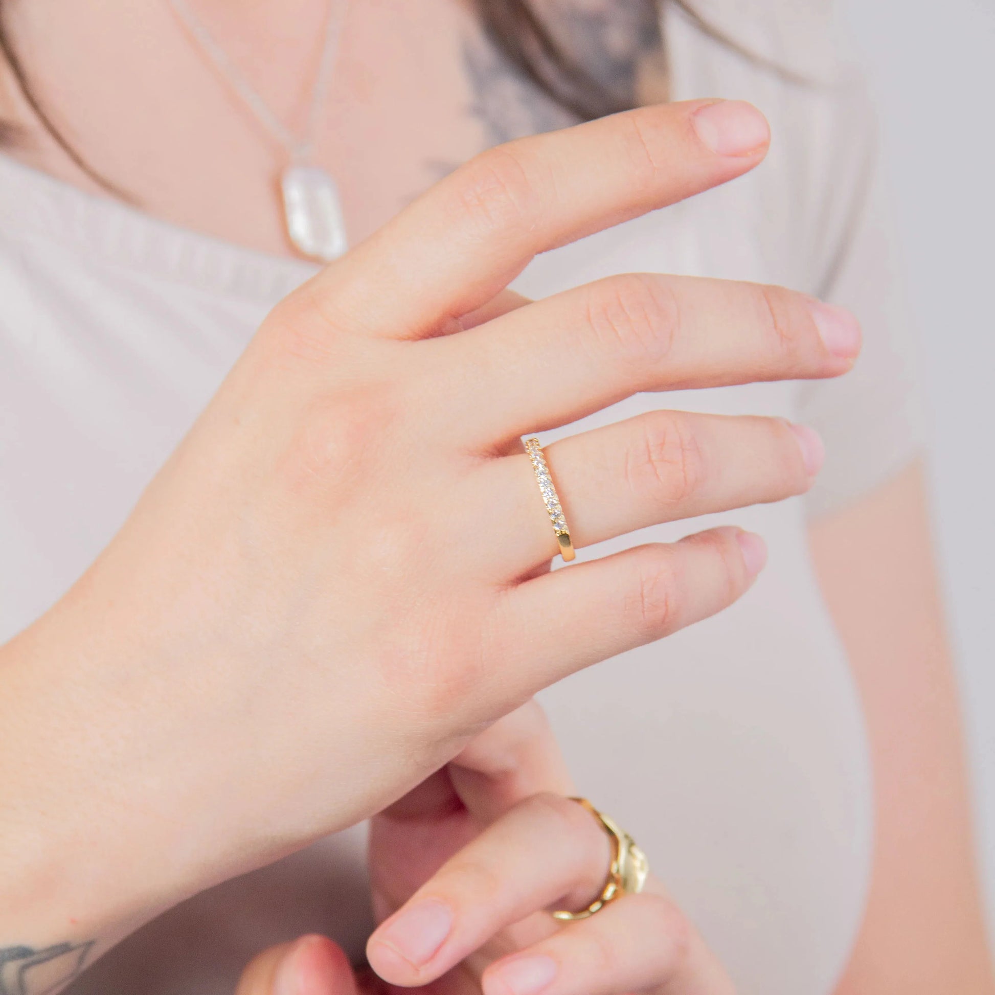Anillo delgado con zirconias chicas redondas Material: Oro laminado 18k