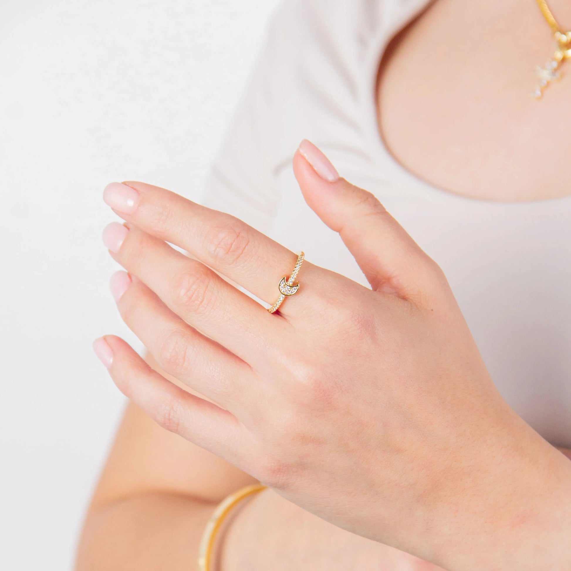 Anillo ajustable con zirconias y luna Material: Oro laminado 18k
